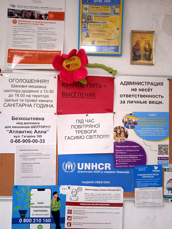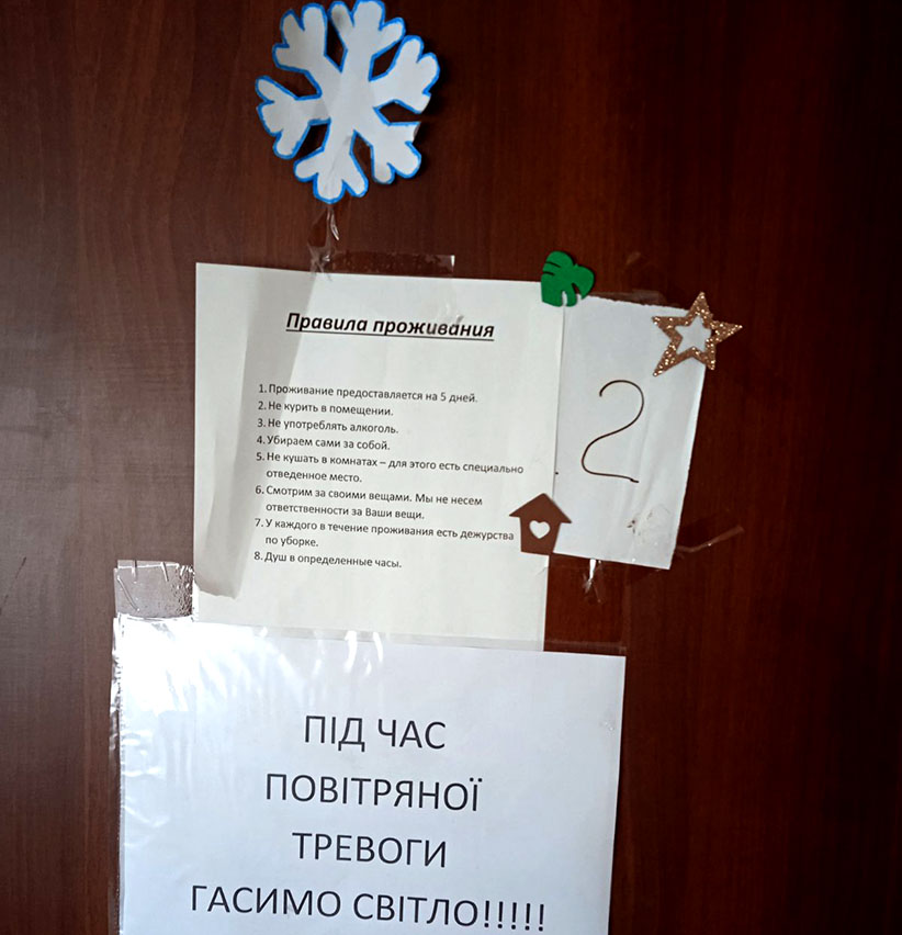 Сергій: – Звісно, є правила проживання у шелтері. Людина заїхала, розписується, що ознайомлена, ми записуємо тільки необхідні дані її. Бо раніше хтось, наприклад, хоче надати допомогу людині, а вона вже виїхала. Або розшукують родичі чи хтось із знайомих, і ми тоді допомагаємо знайтися.