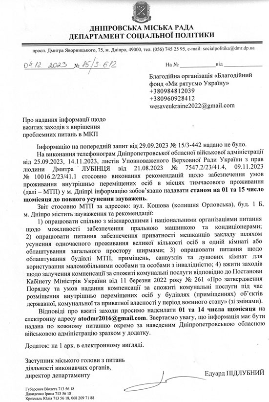 Можу тільки констатувати, що у мерії Дніпра відповіли, майже дослівно: «Ви захотіли допомогти людям, захотіли погратися – будь ласка, без питань, уперед і з піснею. Але це – комерційна будівля. Якби ви, припустимо, у школі цей шелтер організували, це зробили, то, можливо, ми вам якусь знижку і якісь пільги організували, але, на превеликий жаль, зараз вам цього не бачити. Бажаєте платити – платіть, бажаєте закрити шелтер – закривайте його».