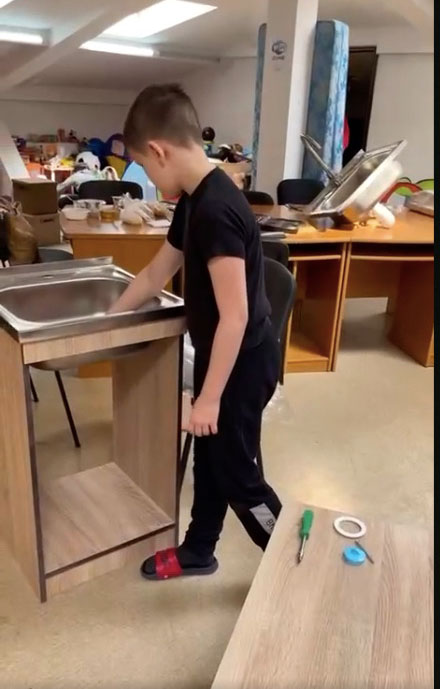 Школярі навчаються онлайн, відсотків 80%. Окремо була кімната для мам із дітками до трьох років, зараз в ній зробили навчальний клас для дітей. Частина з них у домашню школу ходять тих міст, звідки вони приїхали. У нас на 2-му та 3-му поверхах є Інтернет, вони навчаються. Є ноутбуки, які видали у школі, та ті, що привезли волонтери у подарунок.