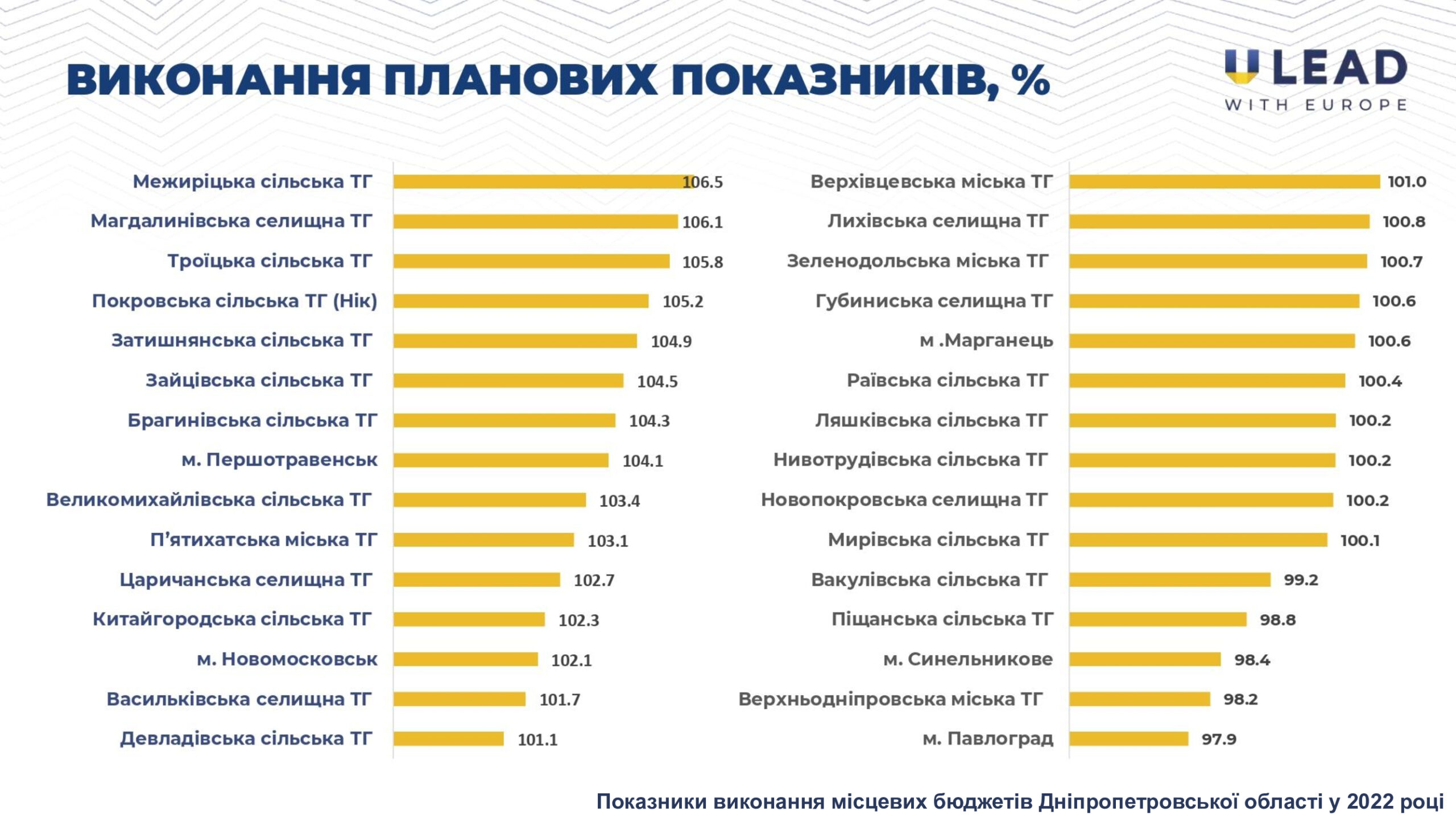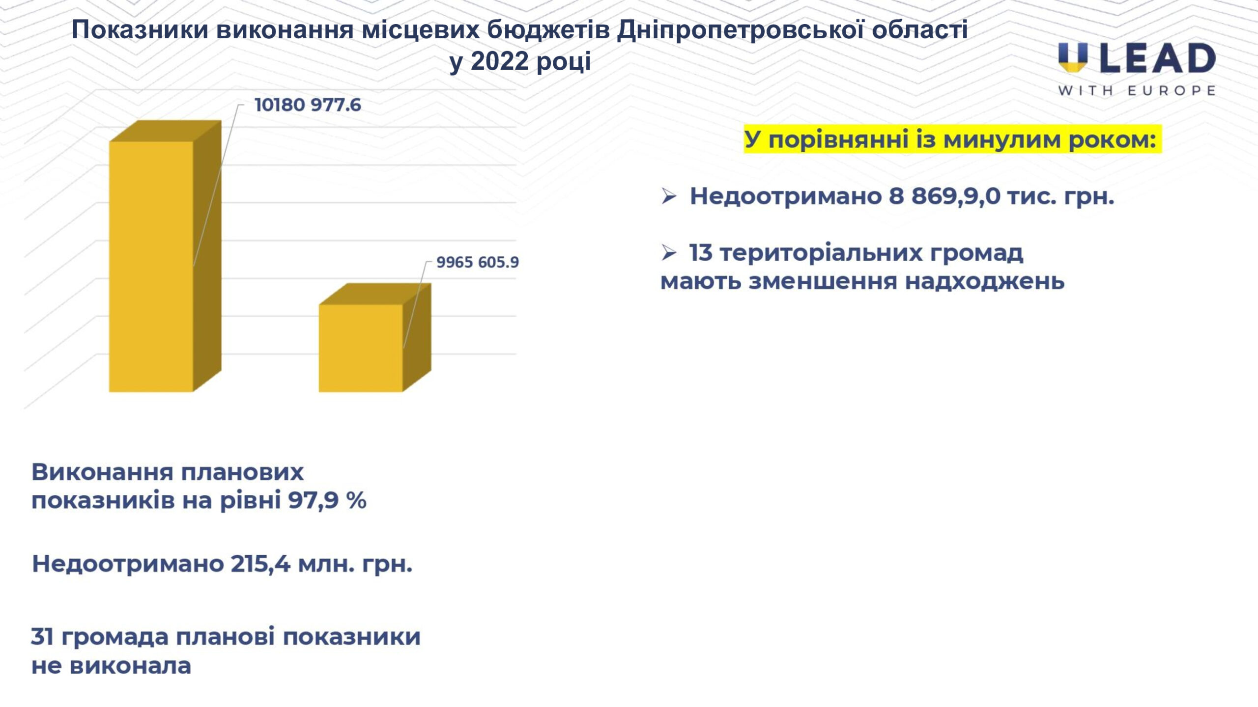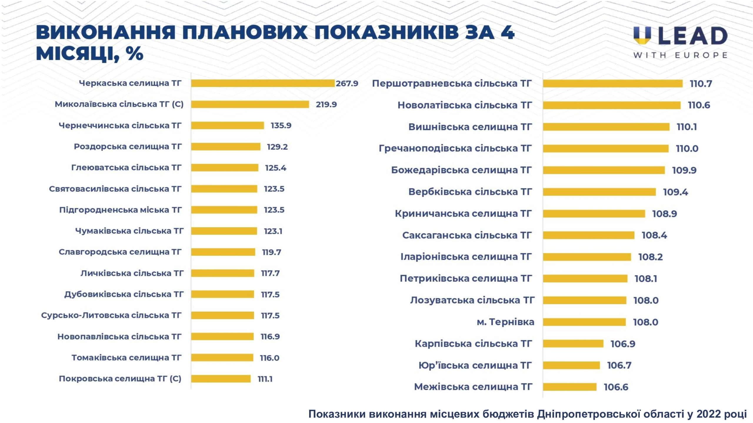 – До місцевих бюджетів територіальних громад Дніпропетровської області за січень – квітень 2022 року надійшло 9 965 млн. грн, що на 1 141,5 млн. грн або на 12,9% більше ніж за аналогічний період 2021 року. При цьому виконання плану – збільшення доходів на 14,9% – за 4 місяці досягнути не вдалося, хоча й відсоток невиконання є незначним та становить лише 2,1%. Планові показники по доходам були виконанні 55 громадами області. Такі громади, як Черкаська та Миколаївська Синельниківського району, мають найбільший відсоток виконання, який складає відповідно 267,9% та 219,9%. Не досягла запланованих доходів 31 громада. Місцеві бюджети цих громад недоотримали 215,3 млн. грн, – зазначив Андрій Мужевський.