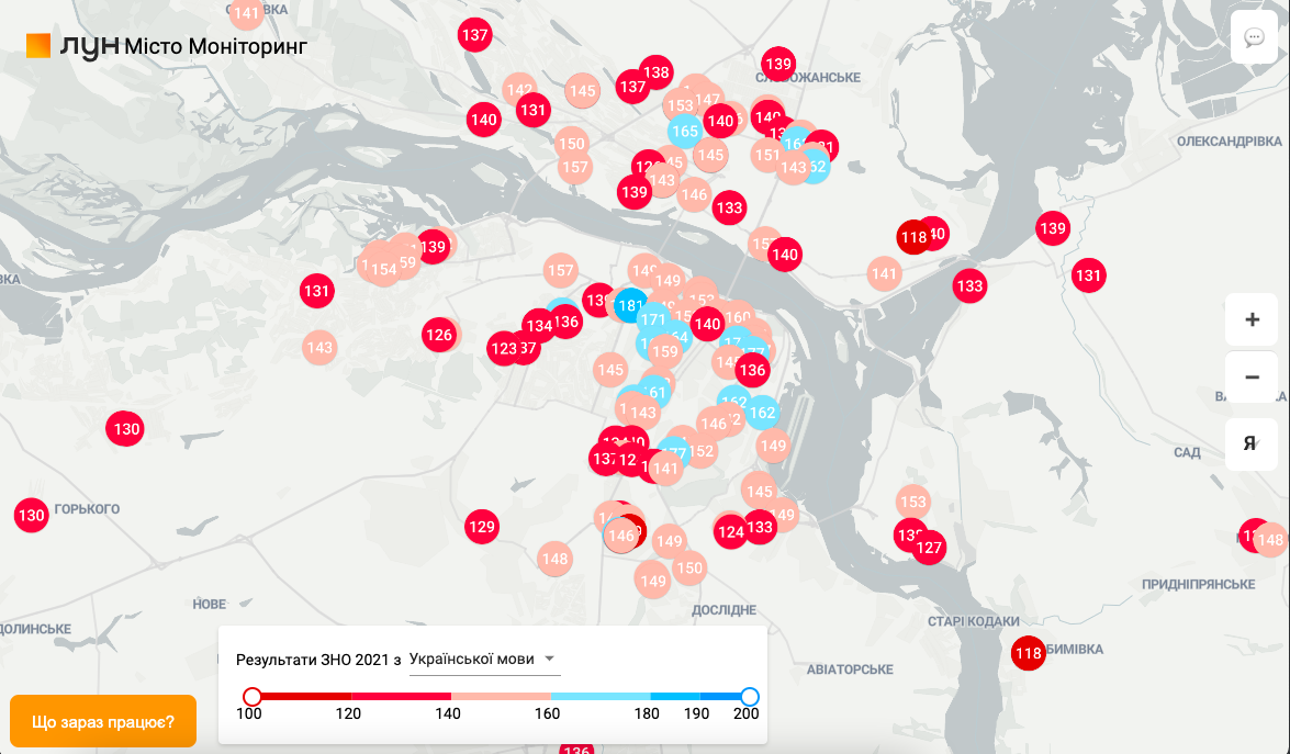 “ЗНО – не єдиний показник якості освіти у школі, але він дає уявлення про рівень навчального закладу. Тому вже третій рік поспіль команда ЛУН Місто робить інтерактивні карти з результатами ЗНО. У минулі роки – це були дані тільки для Києва, цього разу ми розширили географію на всю Україну, крім тимчасово окупованих територій, по яких немає даних”, – коментує кураторка ЛУН Місто Анна Денисенко.