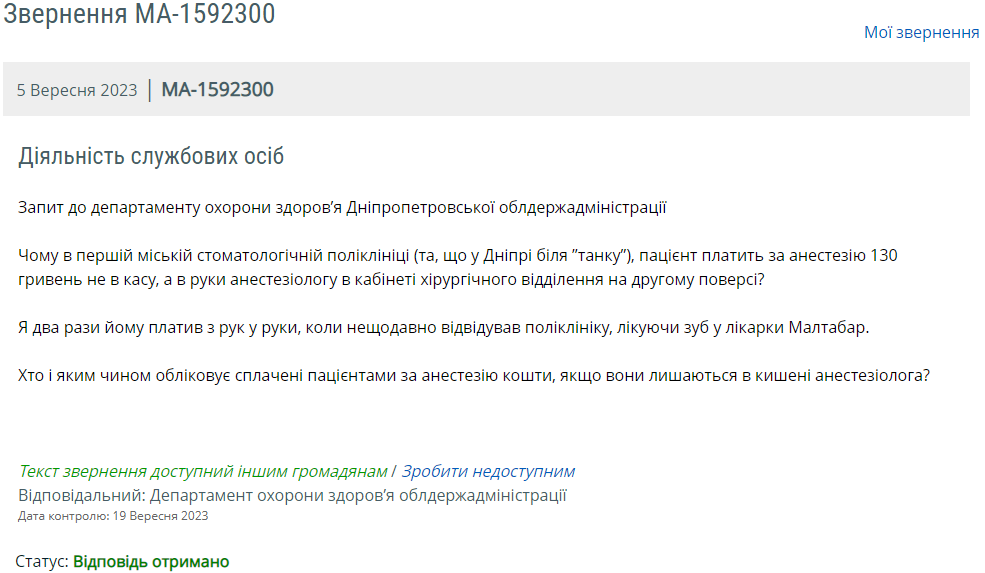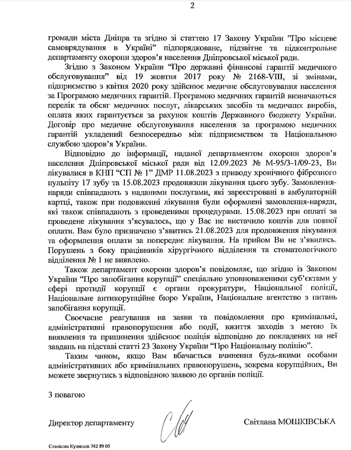 Написали, коли я і навіщо звернувся до Комунального некомерційного закладу «Стоматологічна поліклініка № 1» Дніпровської міської ради, зазначили номер і діагноз зуба, нагадали, що у мене не вистачило грошей для повної оплати, а на призначений третій прийом я не явився…