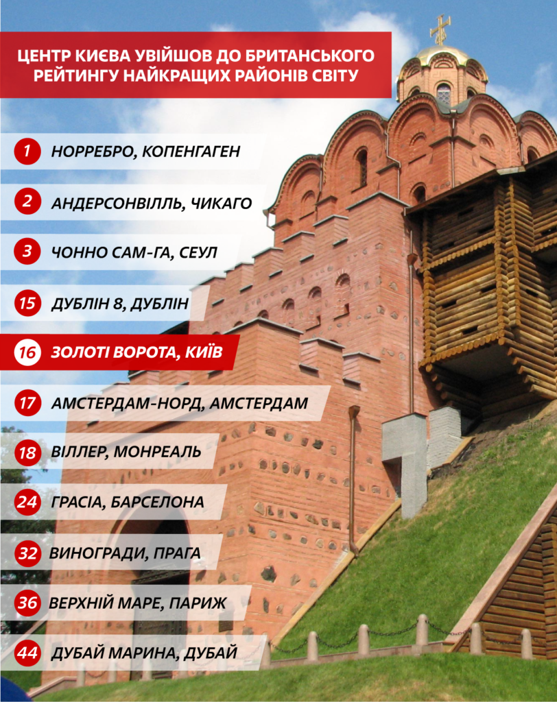 Центр Києва, зокрема мікрорайон Золотих воріт посів 16 місце у британському рейтингу 49 найкращих районів світу. Укладачі назвали його історичним серцем міста та водночас зразком прогресивності.