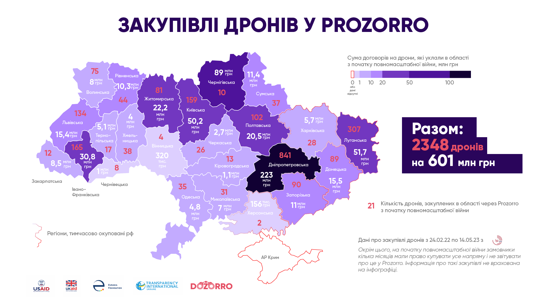 За підрахунками проєкту DOZORRO за час повномасштабної війни через Prozorro придбали щонайменше 2348 безпілотників на 601 млн грн по всій Україні.