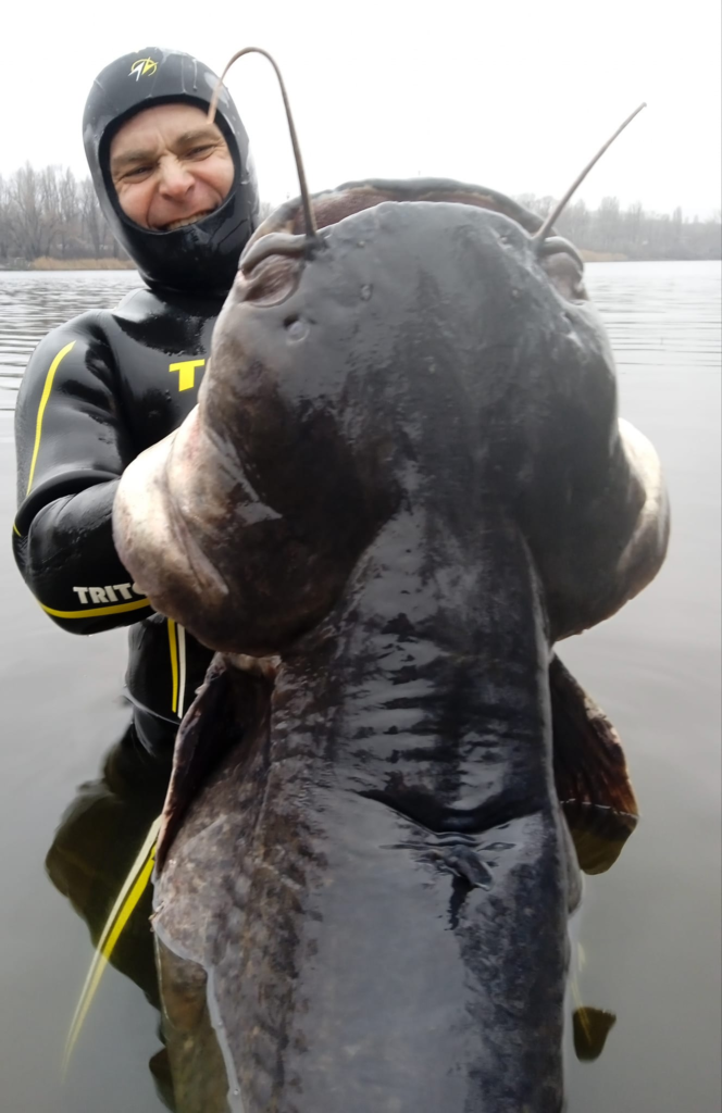“Я стріляв у сома, а розжарений гарпун пронизав його товстелезну спину. Почалася боротьба, сом дуже активно тягнувся до глибини, і я намагався тримати його за канат, що з’єднує гарпун з гарматою, ситуація дуже схожа на фільми про Кітобое. І коли я майже заспокоїв його, сом не піддався і показав свої канібальські схильності – він атакував мене за ногу, а потім вирішив відкусити частину моєї ласти“, – каже рибалка Олександр.