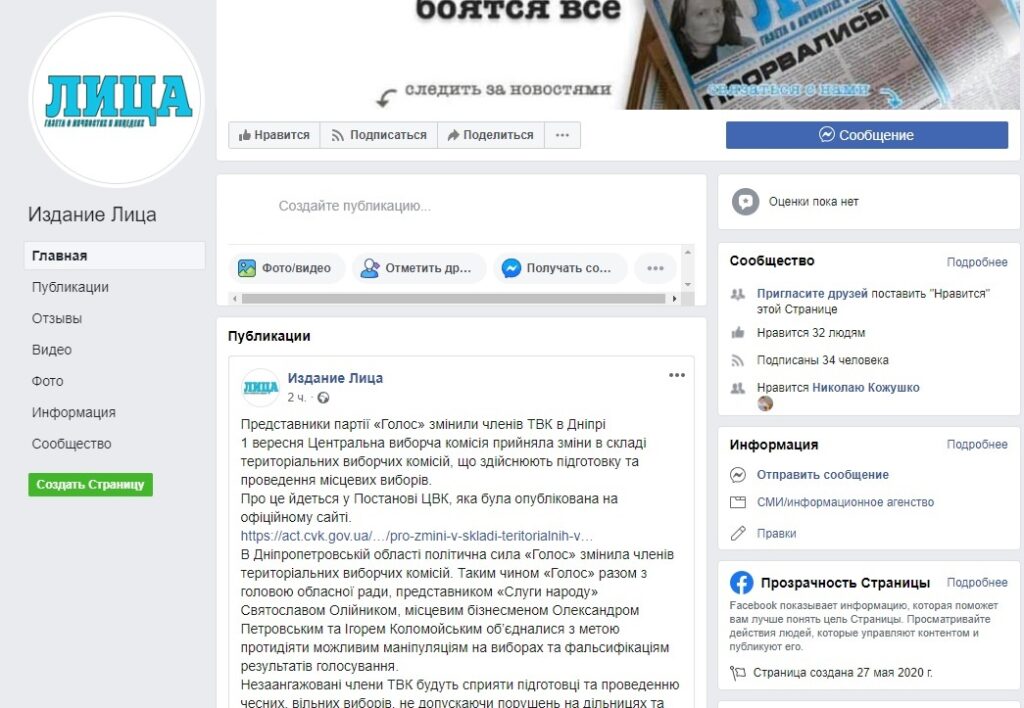 Фейкова сторінка «Издание Лица» має 34 підписники, створена 27 травня 2020 року, не має посилання на наш сайт та проміж репостів наших новин публікує неправдиву інформацію, яка ніколи на нашому сайті не виходила.