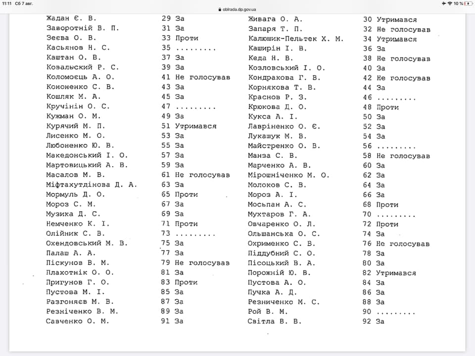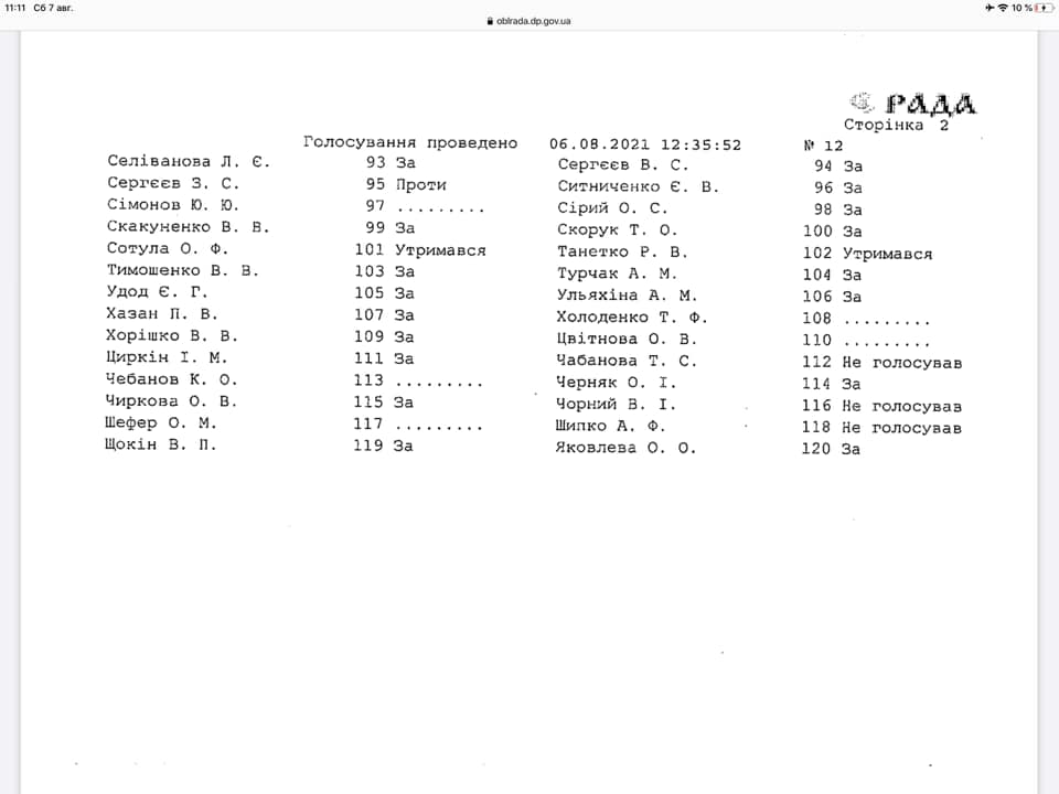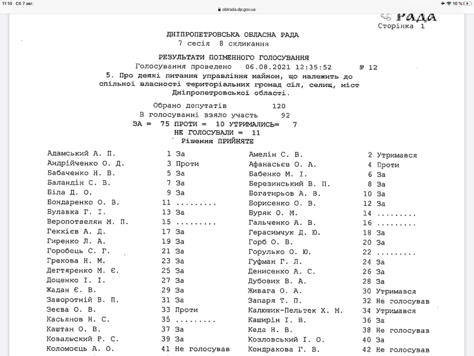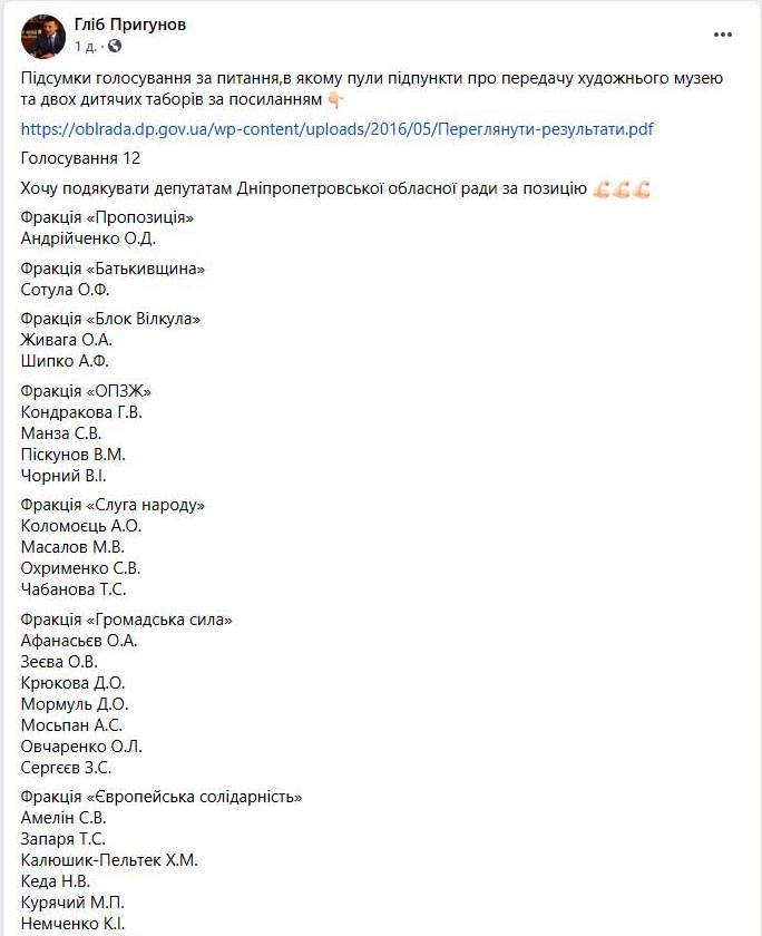 «Підсумки голосування за питання, в якому були підпункти про передачу художнього музею та двох дитячих таборів за посиланням: https://oblrada.dp.gov.ua/wp-content/uploads/2016/05/Переглянути-результати.pdf