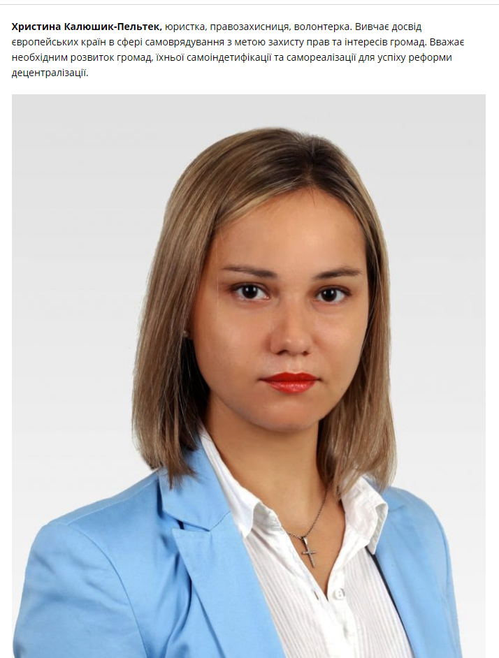 «Христина Калюшик-Пельтек, юристка, правозахисниця, волонтерка. Вивчає досвід європейських країн в сфері самоврядування з метою захисту прав та інтересів громад. Вважає необхідним розвиток громад, їхньої самоіндетифікації та самореалізації для успіху реформи децентралізації», – йдеться в представленні першої п`ятірки списку «ЄС» до Дніпропетровської обласної ради, опублікованому на офіційному сайті партії.