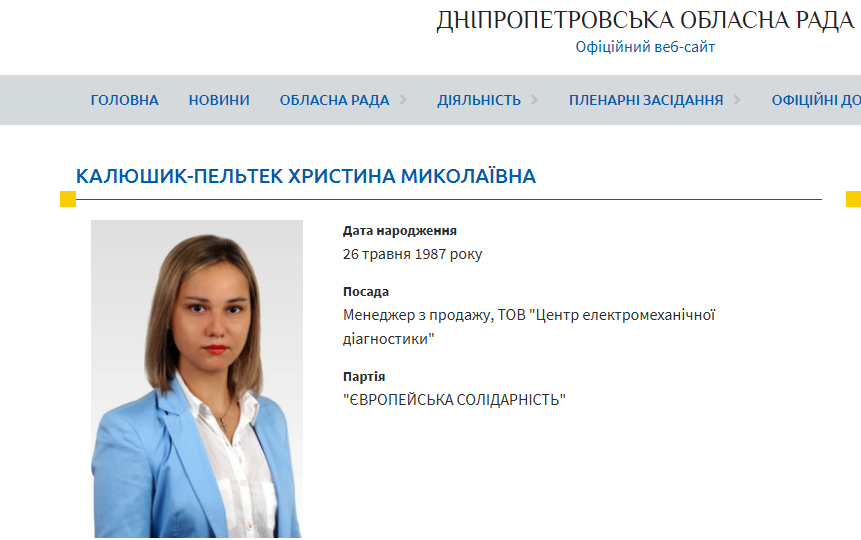 Про це «Лица» дізналися з декларації Христини Калюшик-Пельтек та з даних офіційних сайтів ЦВК та Дніпропетровської обласної ради.
