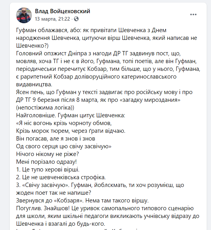 “Звернувся до «Кобзаря». Нема там такого віршу. Погуглив. Знайшов! Це уривок самопального типового сценарію для школи, яким шкільні педагоги викликають учнівську відразу до Шевченка і взагалі до будь-кого. Ітого. Гуфман, маючи раритетний «Кобзар» і написавши пронікновенний пост для своїх виборців, типа, цитуючи Кобзаря – того Кобзаря навіть не відкривав”, – написав Войцеховський.