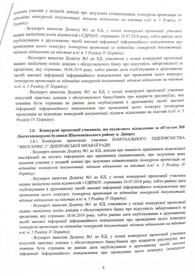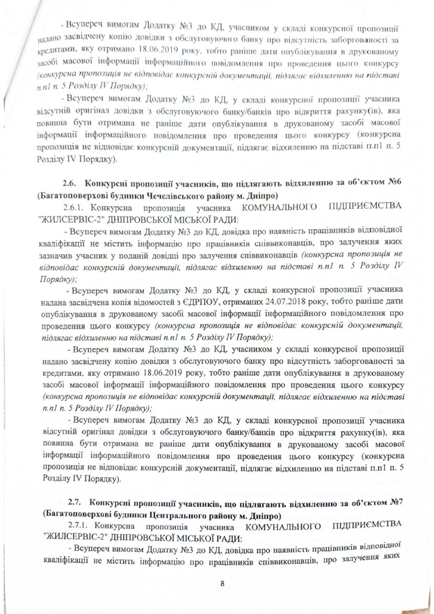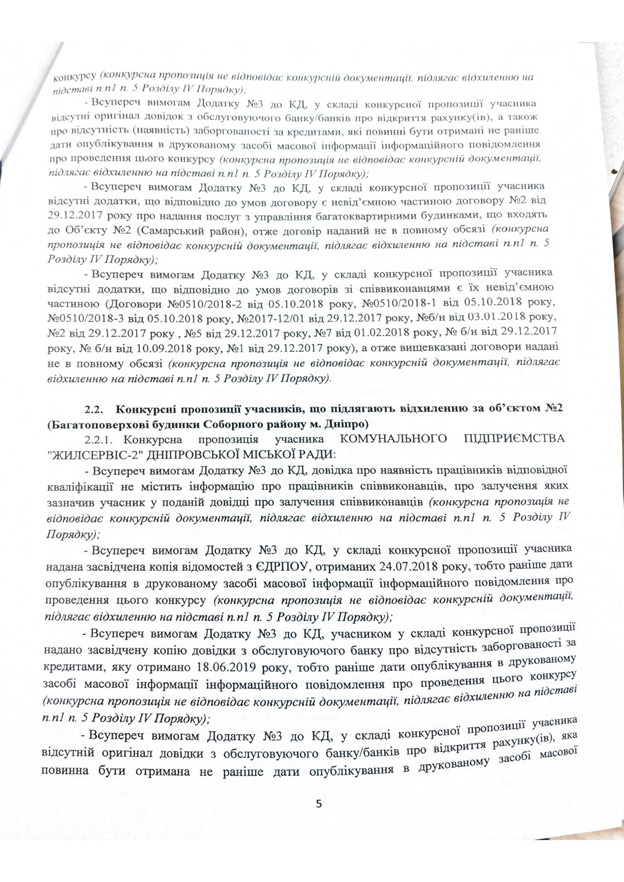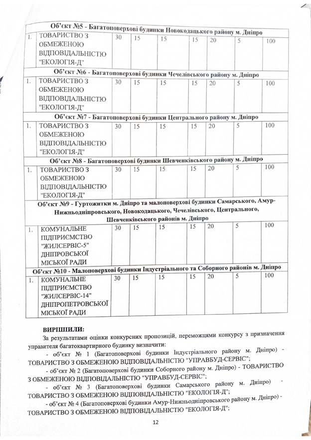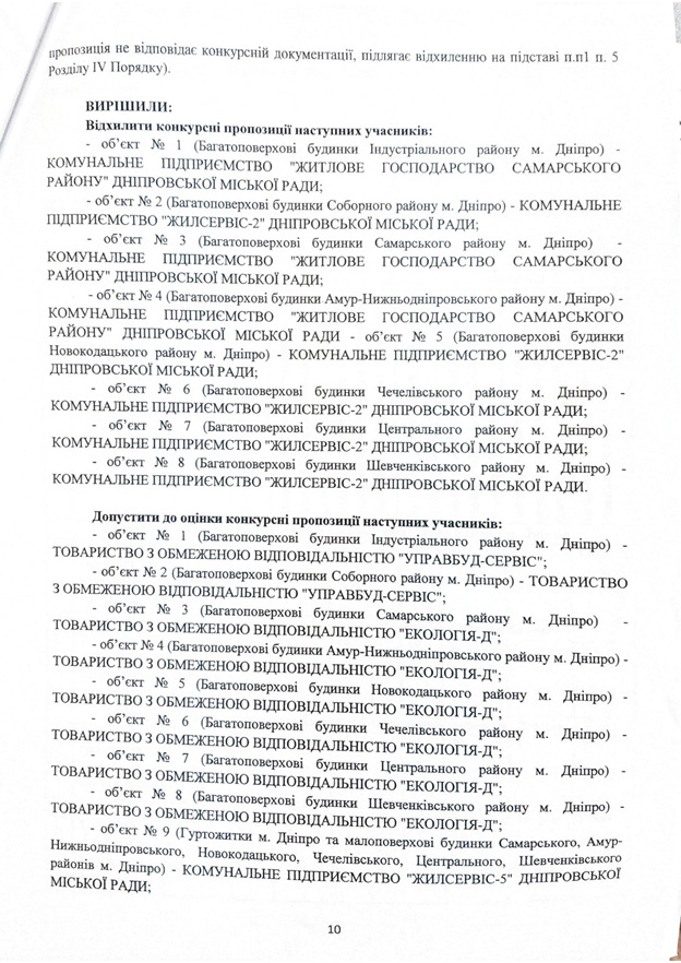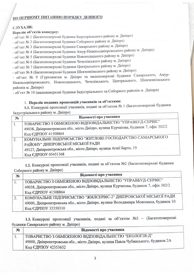 Объект № 1 (многоквартирные дома в Индустриальном районе). Обслуживать эти дома изъявили желание ТОВ «Управбуд» и КП «Жилищное хозяйство Самарского района». Конкурсное предложение последнего участника отклонено по таким причинам: