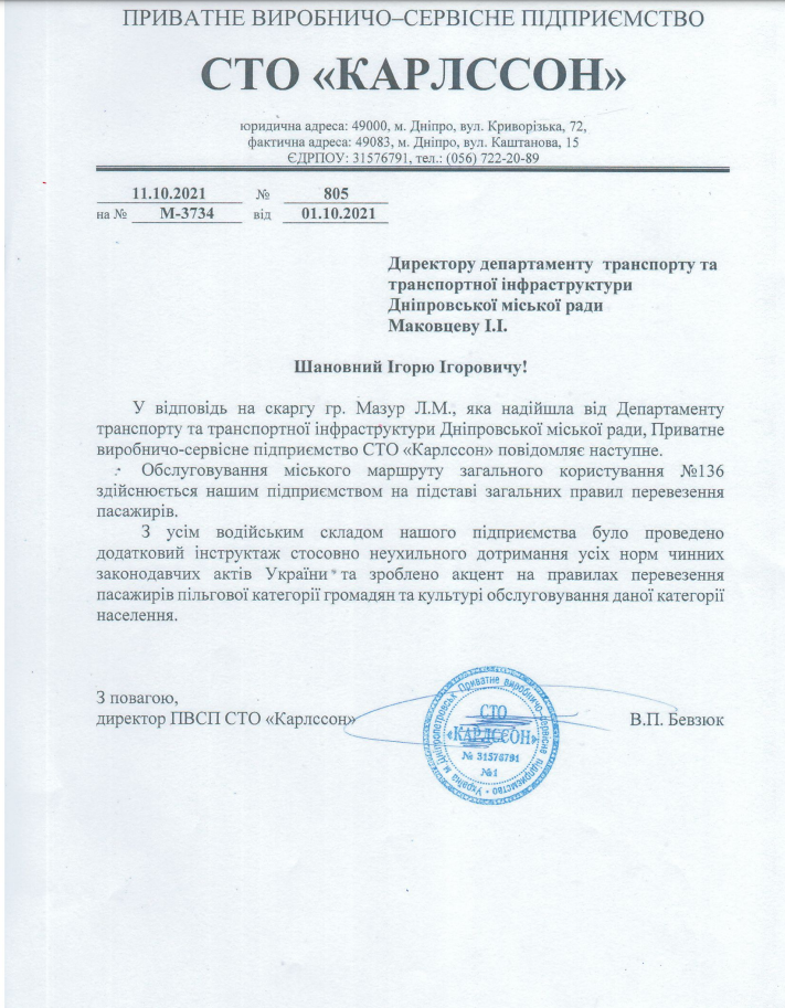 Про цинічну брехливість наведених рядочків про «інструктажі» знають і в департаменті транспорту міської ради Дніпра під орудою І.І. Маковцева. Бо це пересилочний пункт у листуванні скаржників зі своїм кривдником – «Карлссоном». Департамент також у курсі і типових порушень автоперевізника, що ніяк не усуваються. Але жодних заходів реагування не вживає, задовольняючись завідомо брехливими відписками директора Бевзюка.