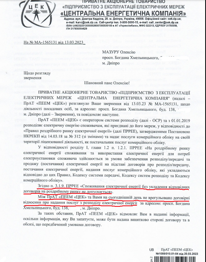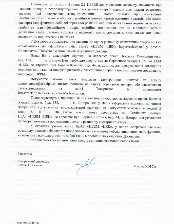 Корса, звісно, не писав так прямо – за скарги і статтю. Просто так «співпало», що його нагадування про неможливість постачання компанією електроенергії до споживача без укладеного індивідуального договору надійшло після низки моїх скарг на «ЦЕК» та операторок кол-центру компанії й надрукованої «Лицами» критичної статті.