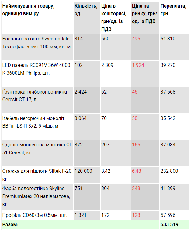 За іншими позиціями у відомості також помітне значне завищення цін порівняно з ринком.