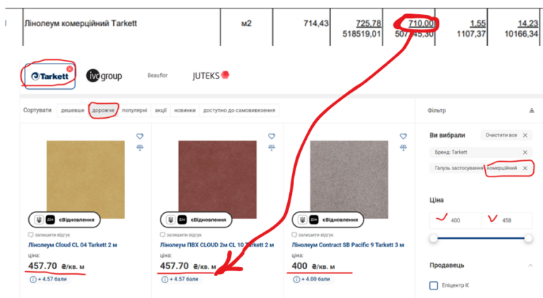 У підсумковій відомості ресурсів 507 тис грн іде на комерційний лінолеум Tarkett по 852 грн/кв. м (тут і далі ціни з ПДВ). Конкретний вид невідомий. «Епіцентр» пропонує комерційний лінолеум Tarkett по 400-458 грн/кв. м. Це в середньому вдвічі дешевше від кошторисної ціни.