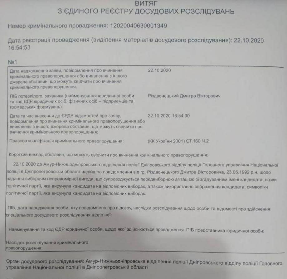 «22.10.2020 до Амур-Нижньодніпровського відділення поліції Дніпровського району Головного управління Національної поліції в Дніпропетровській області надійшло повідомлення від гр. Різдвонецького Дмитра Вікторовича, 23.05.1992 р. н. щодо надання виборцям неправомірної вигоди, що супроводжується передвиборчою агітацією зі згадуванням імені кандидата, назви політичної партії, яка висунула кандидата на відповідних виборах, а також використання зображення кандидата, символіки політичної партії, яка висунула кандидата на відповідних виборах», — вказано у витязі з єдиного реєстру досудових розслідувань.