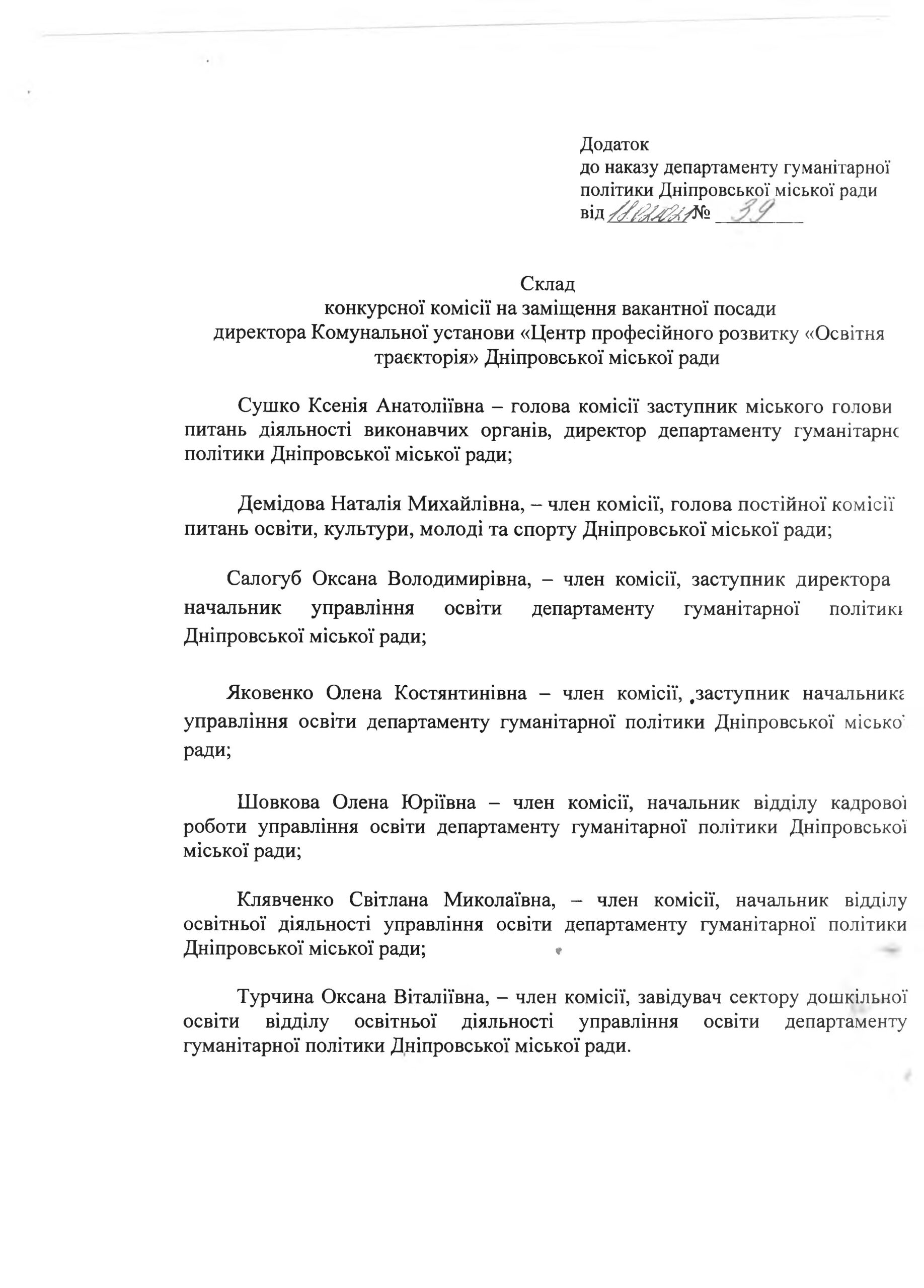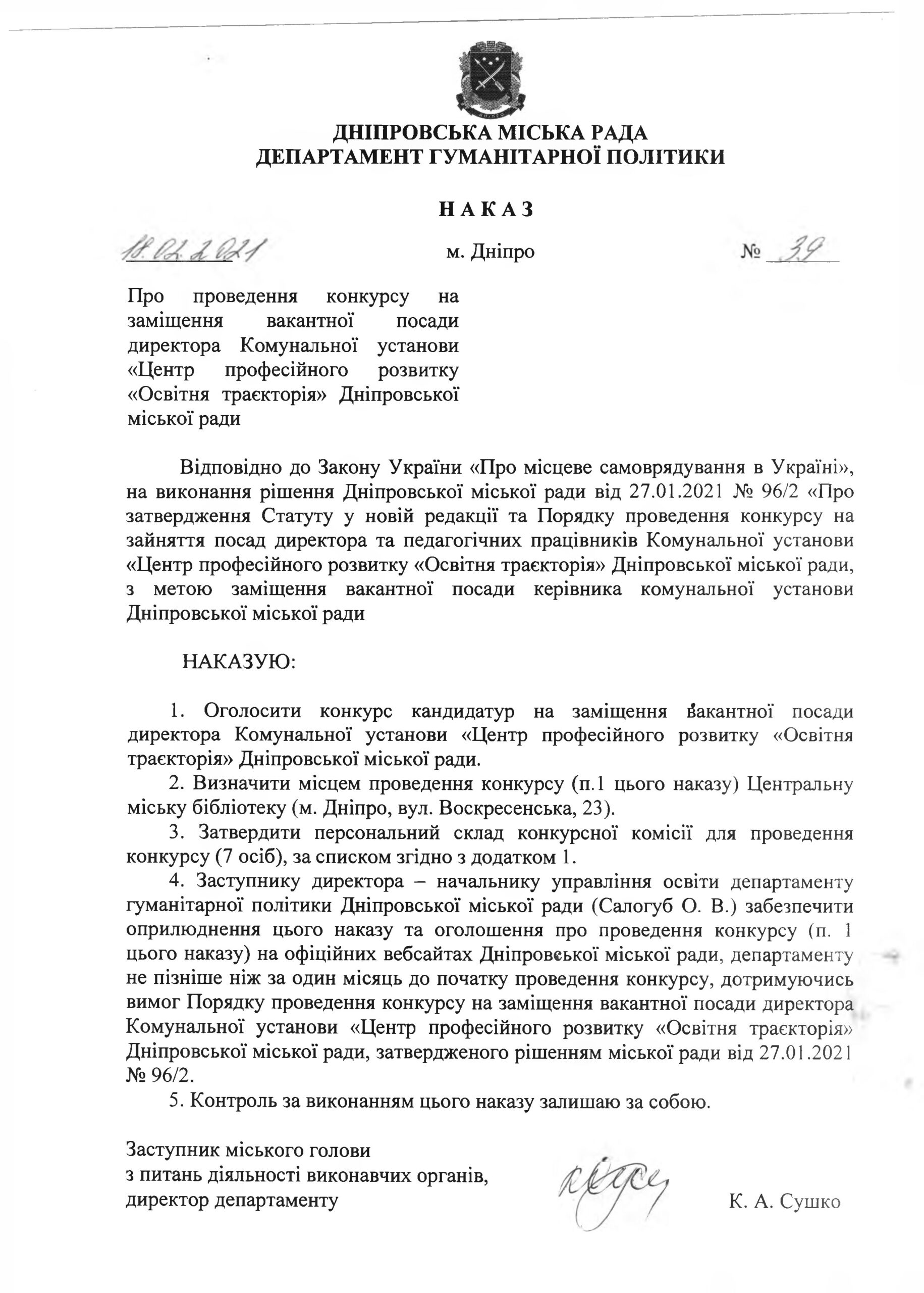 Так, на виконання Порядку проведення конкурсу на зайняття посад директора та педагогічних працівників КУ, заступниця міського голови Дніпра Сушко Ксенія Анатоліївна видала Наказ № 39 від 18.02.2021 про оголошення конкурсу кандидатур на заміщення вакантної посади директора КУ.