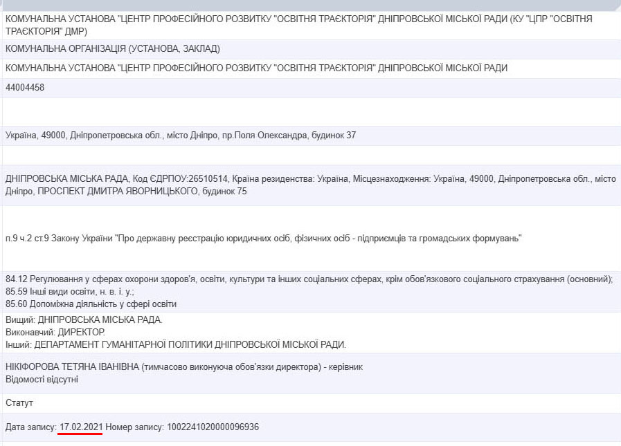 Центр професійного розвитку «Освітня траєкторія», який був позавчора зареєстрований, є комунальною установою (КУ) і на 100% належить Дніпровській міській раді.
