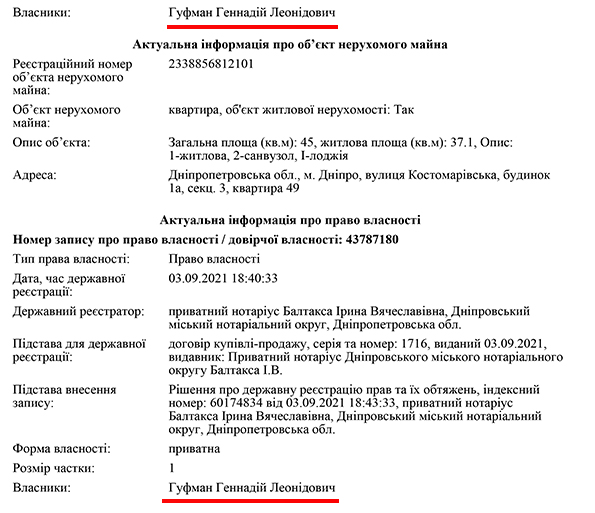 Дві квартири за три місяця придбав перший заступник голови Дніпровської обласної ради, голова депутатської фракції партії «Опозиційна платформа – За життя» (ОПЗЖ) у облраді Гуфман Геннадій Леонідович.