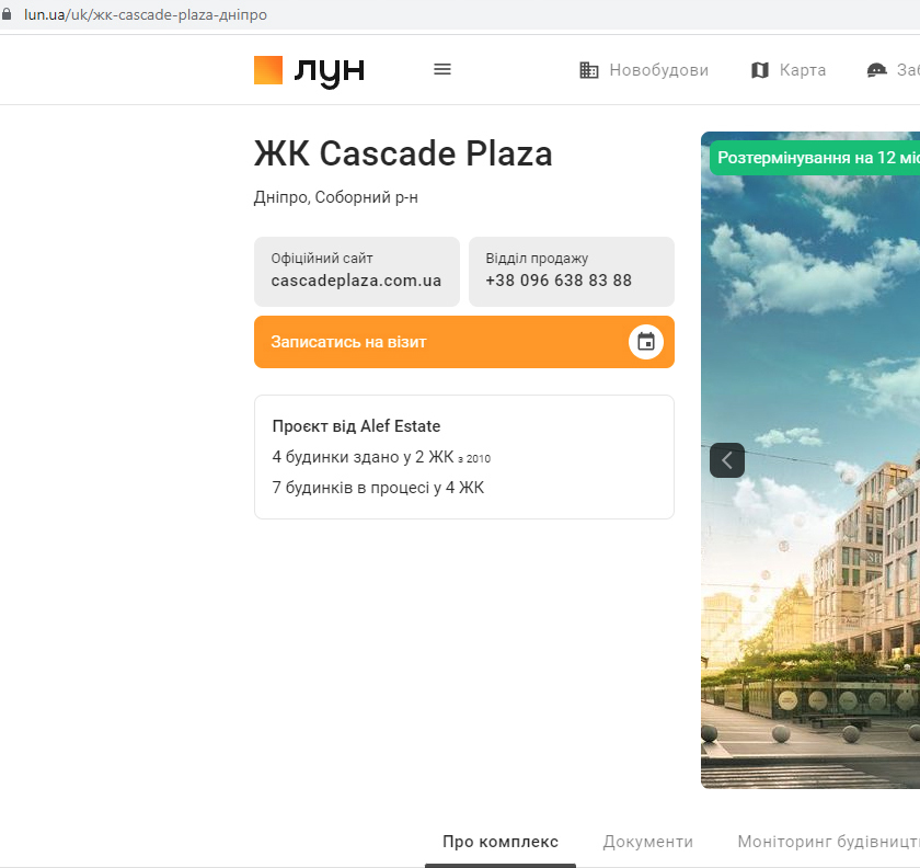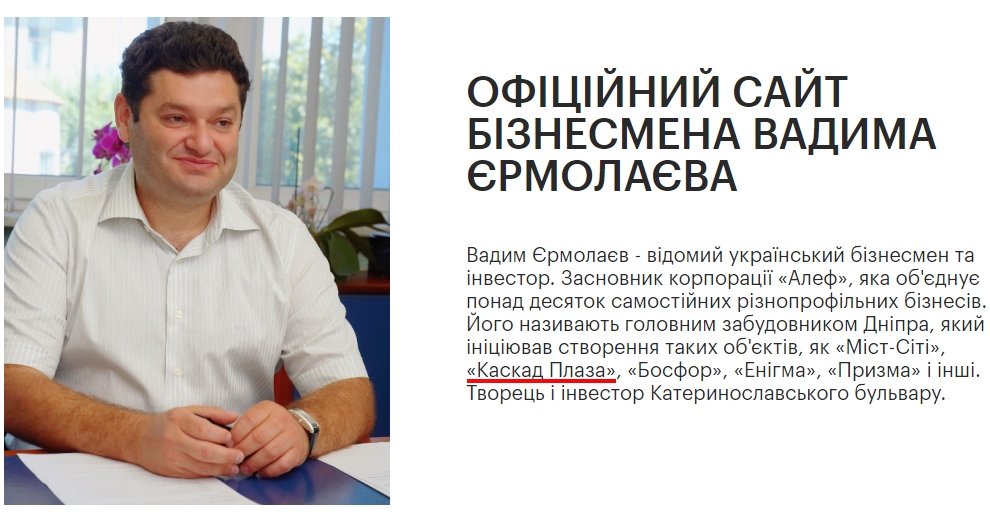На офіційному сайті бізнесмена Вадима Єрмолаєва повідомляється про приналежність ЖК «Каскад Плаза» до об’єктів корпорації «Алеф».