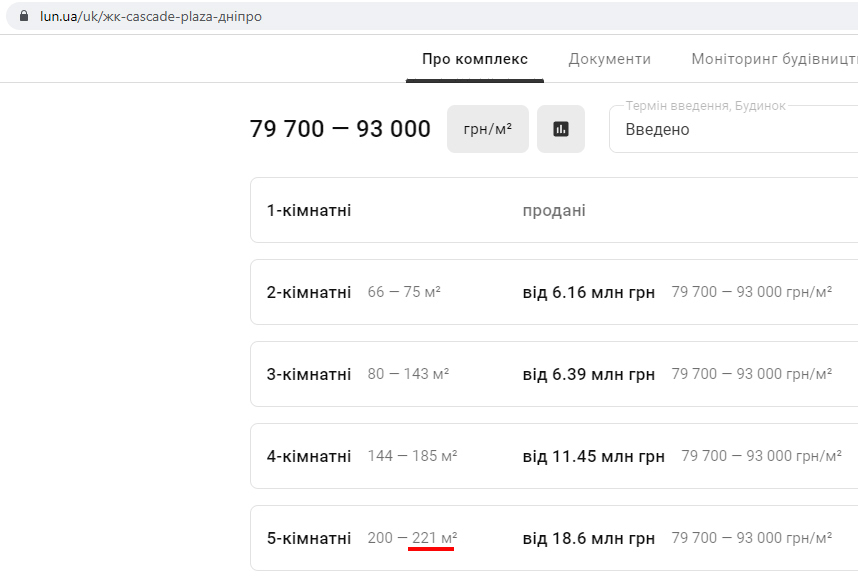 При цьому на сайтах оголошень щодо ЖК «Каскад Плаза» зазначено, що найбільша квартира тут – 5-кімнатна на 221 кв.м, і коштує така від 18.600.000 гривень