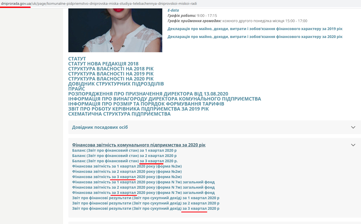Так, останнє у відповідь на інформаційний запит щодо фінансової звітності за 2020 рік Комунального підприємства «Дніпровська міська студія телебачення» Дніпровської міської ради 26 лютого 2021 року надіслала запитувачу лише фінансову звітність за три квартали минулого року, при тому, що граничний термін подання підприємствами річної фінансової звітності за минулий щорічно спливає 20 лютого.