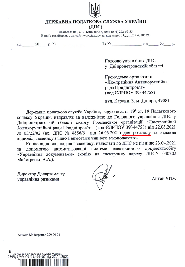 «Державна податкова служба України, керуючись п. 191 ст. 19 Податкового кодексу України, направляє за належністю до Головного управління ДПС у Дніпропетровській області скаргу … для розгляду», – йдеться у листі ДПС від 22.04.2021р. за підписом директора Департаменту управління ризиками ДПС Чижа Антона Юрійовича.