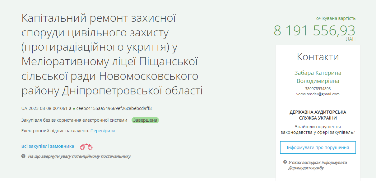 4) Або ось вирішили збудувати бомбосховище. Але забили на закон, який вимагає проводити конкурентні закупівлі, вони просто 15 днів папірці складали і казали немає часу проводити конкуренту процедуру. Як результат в школі на 330 учнів, будуть одне з найдорожчих бомбосховищ в області за 8.2,млн.грн. Будує фірма Стройінвест (яку згадували раніше). Ми перевірили 30 позицій в цій закупівлі і усюди завищення було на 30% відносно ринкових цін.