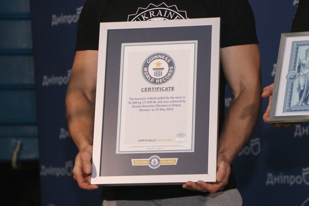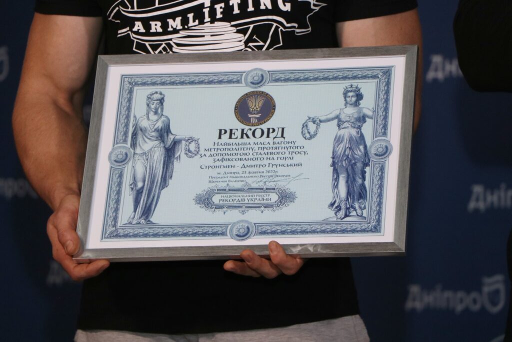 У Дніпрі Дмитро Грунський протягнув на тросі, прикріпленому до шиї, вагон метрополітену вагою 32,5 тонни. Це новий Національний рекорд України та Гіннеса.