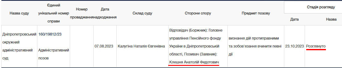 Нагадаємо, Анатолій Клешня у 2019-му вже судився за пенсію з Пенсійним фондом, але всіх виграних 900.098,66 грн «сплати заборгованості з оплати пенсії» поки не отримав – лише 187.272,92 грн.