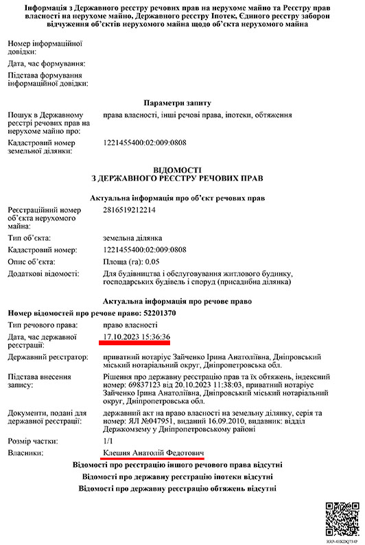 Цікаво, що Анатолій Клешня зареєстрував в держреєстрі речових прав свою земельну ділянку 1221455400:02:009:0808 в селищі Обухівка Дніпровського району за декілька годин до того, як на селище Обухівка була здійснена ракетна атака російськими «Іскандерами».