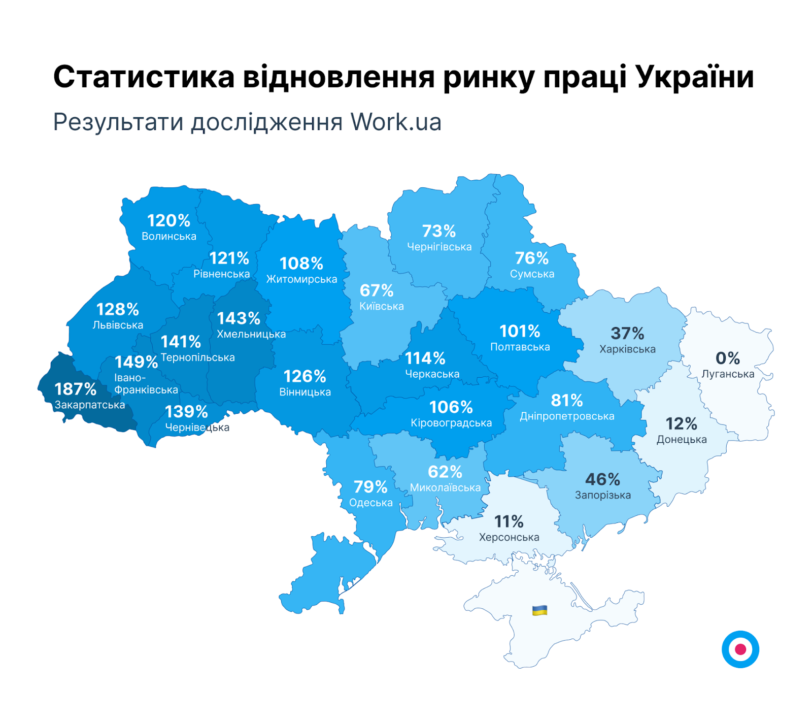 Кількість вакансій у травні 2023 року до лютого 2022 року. Частка відновлення ринку праці за областями. На Дніпропетровщині ринок праці у травні 2023 становить 81% від кількості вакансій лютого 2022.