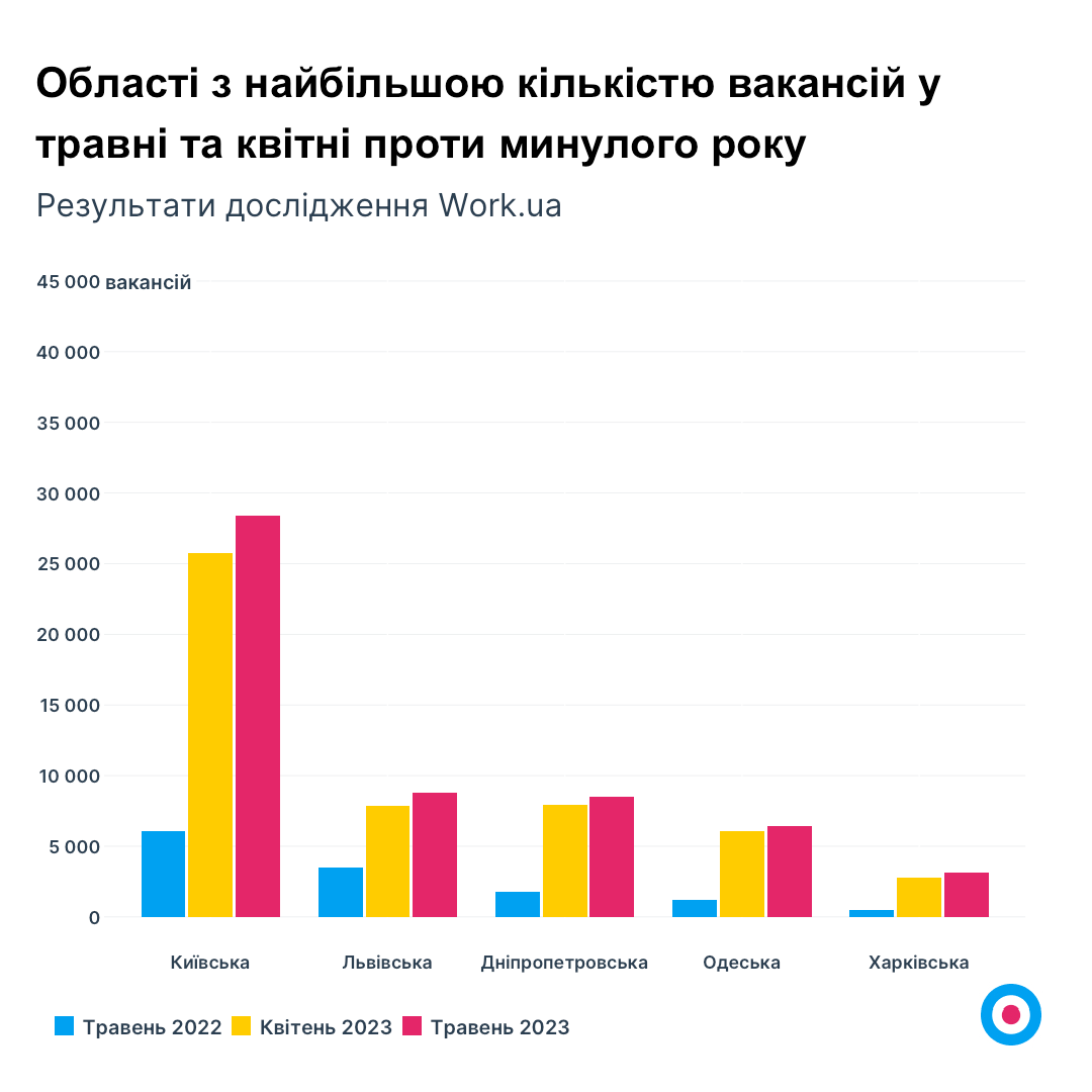 У травні зростання кількості вакансій спостерігається особливо в прифронтових областях та регіонах на заході України. Найбільший приріст, як порівняти з квітнем, був зафіксований у Тернопільській (+17% — 2 171 вакансія), Івано-Франківській (+14% — 2 832), Сумській (+13% — 828), Рівненській (+13% — 1 868) та Харківській (+12% — 3 131) областях.
