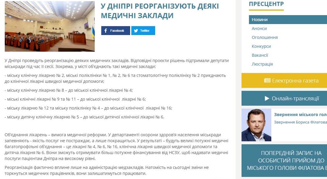 «Статья 16 Закона Украины «Про основы здравоохранения в Украине». Местные органы самоуправления осуществляют планирование развития сети коммунальных учреждений охраны здоровья, принимают решения о создании, ликвидации, реорганизации или перепрофилирования этих учреждений самостоятельно, но с учетом плана развития госпитального округа.