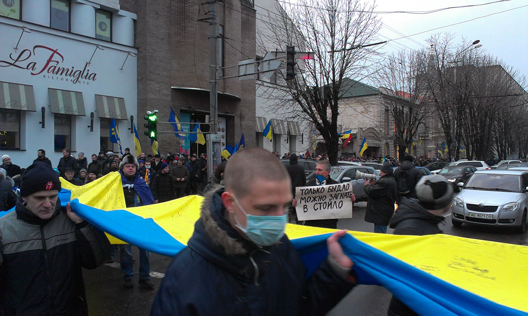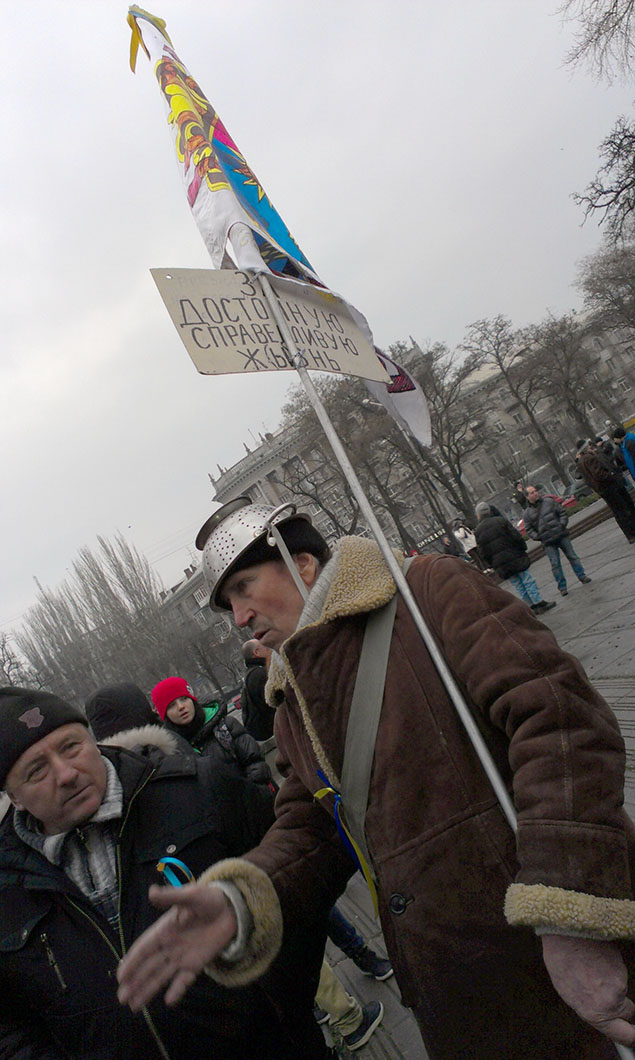 И на майдане в Днепропетровске, и по всей Украине не только кастрюлеголовые были. Люди надевали на головы вёдра, дуршлаги, впервые тогда я увидела балаклаву. Ха-ха, и медицинские маски в тот день надевали! Автор с подружкой были в карнавальных масках.