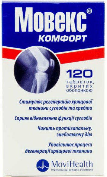 Одним из таких способов лечения является препарат Мовекс. Это лекарство выпускается венгерской фармкомпанией «МЕДИТОП ФАРМАСЬЮТИКАЛ ЛТД» и реализуется в сети украинских аптек в двух формах: Мовекс Актив и Мовекс Комфорт. Обе формы препарата выпускаются в виде таблеток с хондропротекторными свойствами. Их назначают для лечения болезней опорно-двигательных структур, сопровождающихся болью, ограничением подвижности, воспалением соединительной ткани и/или ее дегенеративно-дистрофическим поражением.