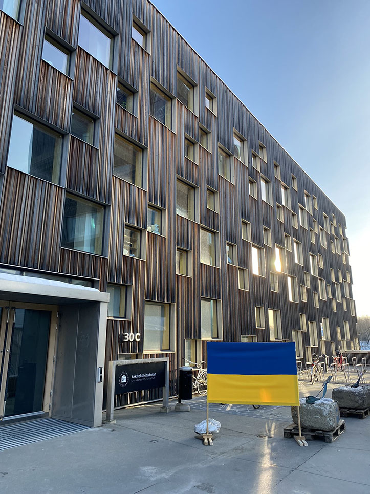 Шведский государственный университет в городе Умео в середине северной части Швеции (швед. Umea universitet) разместил желто-голубой баннер.