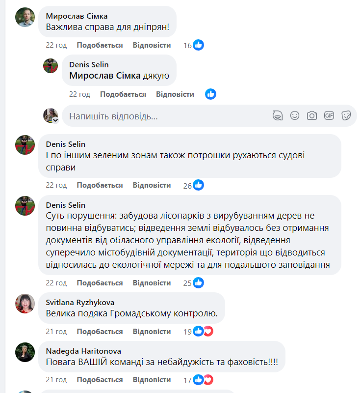 У коментарях під дописом Денис Селін повідомив, що “Громадський контроль” працює й над іншими справами по забудовам лісопарків.