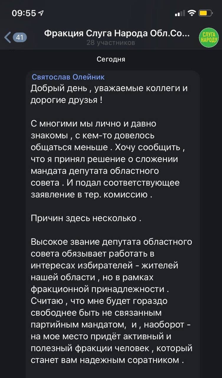 “Поза політичною приналежністю і різними мандатами, ми повинні на перше місце ставити загальнолюдські цінності, дружні і ділові стосунки, служіння суспільству і нашій країні. Бувають випадки, коли мандати сприяють цьому, а бувають – коли ні. Я вибираю свободу і чистоту стосунків, а мандат повертаю партії”, – написав Олійник у своєму зверненні до колег по фракції.