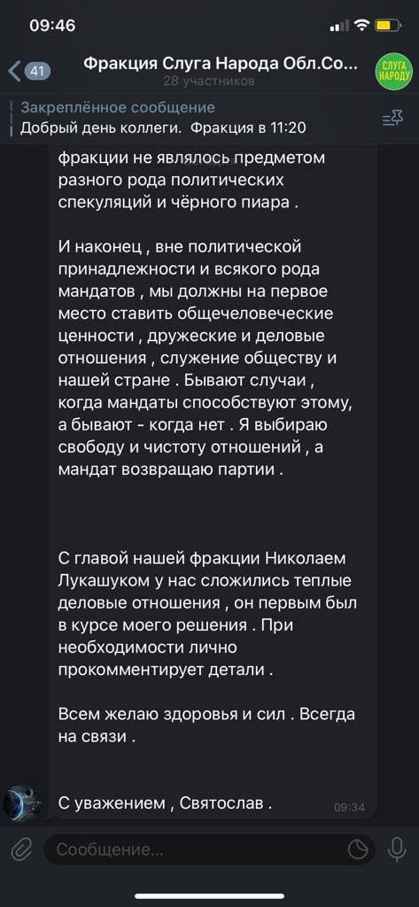 Про це Святослав Олійник повідомив у спільноті фракції “Слуги народу” у Дніпропетровській обласній раді.