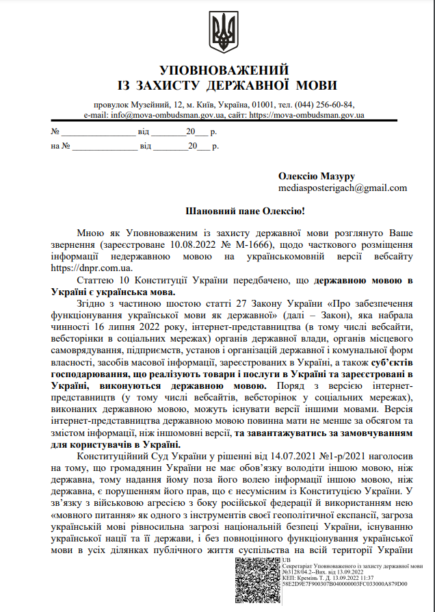 “…мною надіслано лист на електронну адресу інтернет-видання «Дніпровська панорама» щодо забезпечення виконання вимог статті 27 Закону”.