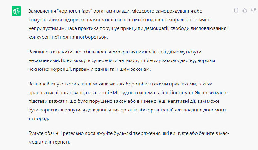 Ось що відповів ChatGPT на питання «Чи можуть органи влади чи місцевого самоврядування, або комунальні підприємства за кошти платників податків замовляти «чорний піар» проти своїх опонентів: політичних опонентів, активістів з громадського сектору тощо?»: