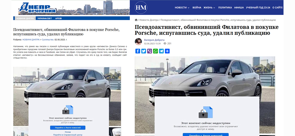 Ось приклад червневого «чорного піару»: 02.06.2023 сайти «Наше місто» і «Днепр вечерний» розмістили під однаковими заголовками «Псевдоактивист, обвинивший Филатова в покупке Porsche, испугавшись суда, удалил публикацию» матеріал про конфлікт міського голови Дніпра Бориса Філатова і громадянського активіста Дениса Селіна.