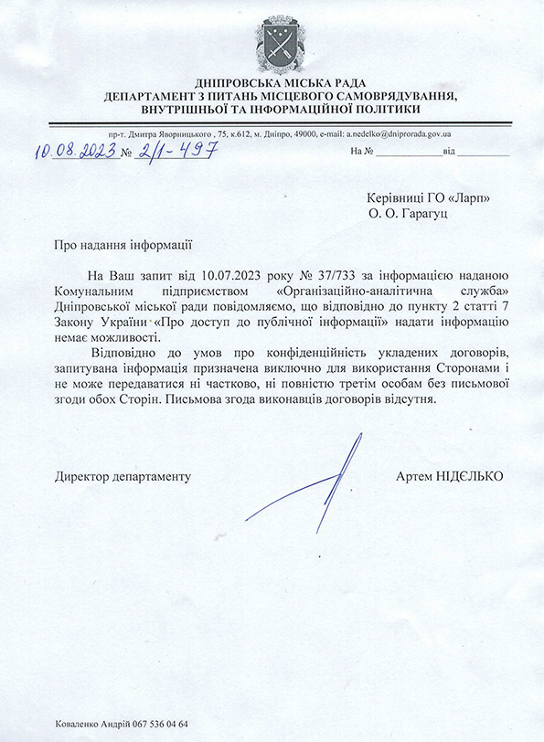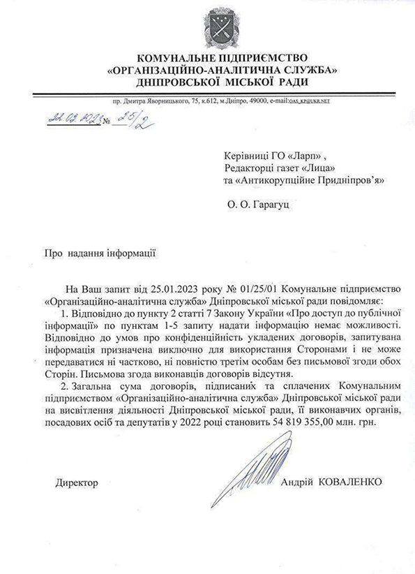 «…Надати інформацію немає можливості. Відповідно до умов про конфіденційність укладених договорів, запитувана інформація призначена виключено для використання Сторонами (чиновниками та суб’єктами господарювання – ред.) і не може передаватися ні частково, ні повністю третім особам без письмової згоди обох Сторін. Письмо згода виконавців договорів відсутня», – написав у відповіді № 25/2 від 22.02.2023р. директор Комунального підприємства «Організаційно-аналітична служба» Дніпровської міськради (КП «ОАС ДМР) Андрій Коваленко.