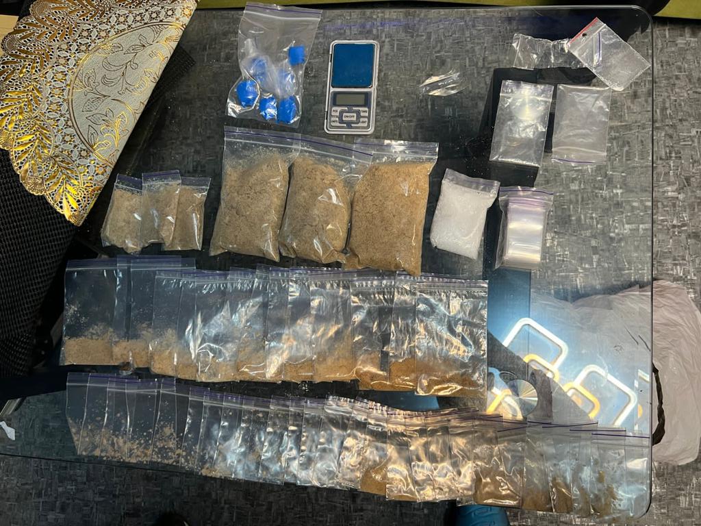 7 грудня під час обшуків за місцями мешкання фігурантів поліцейські вилучили 50 сліп-пакетів з метамфетаміном вагою понад 500 г, майже 50 замотаних згортків з мефедроном, сліп-пакети з марихуаною, понад 140 різних пігулок, серед яких метадон, екстазі, сліп-пакети з порошкоподібною та кристалічною речовиною, електроні ваги, набої.