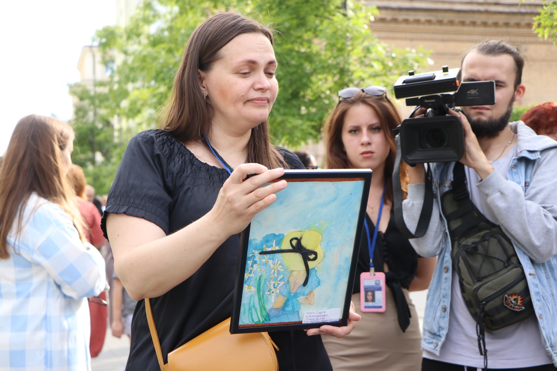 «Також хочу показати одну дитячу роботу, але з потужною історією. Сам малюнок не пов‘язаний з війною, але особливість цієї картини у записці, цитую: «Я дівчинка, у 2020 році переїхала з міста Волновахи до Кам‘янського. У Волновасі жили мої бабуся та дідусь, зараз їх будинку немає». Це, насправді, емоційна робота, і те, що ми зараз робимо – ми робимо для нашої перемоги. Наші військові переходять до наступу, і ми своєю творчою спільнотою переходимо до наступу. Бо якщо ми не допоможемо їм, то хто допоможе нам», – зазначила директорка КП «Школа сучасного образотворчого мистецтва та дизайну ім. Вадима Сідура» ДМР, кураторка виставки Яна Куніцька.