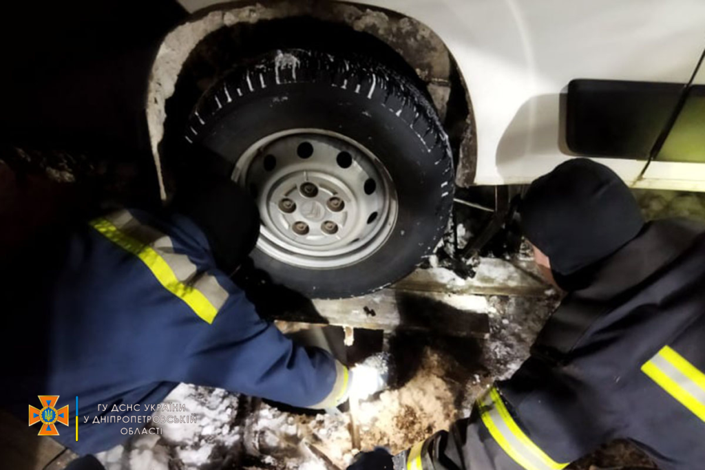 Це сталося близько 21:49. Рятувальники, прибувши на місце, за допомогою домкрата підняли автомобіль і підклали під заднє колесо дошку. Так транспорт зміг виїхати самотужки.