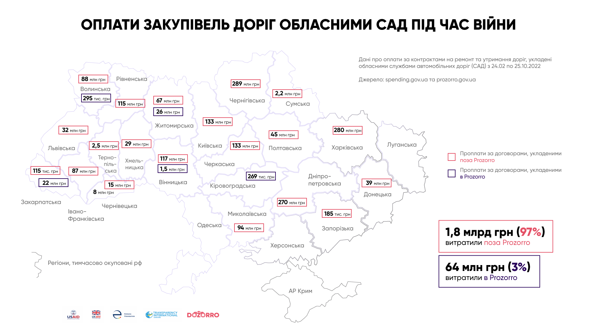 З 24 лютого служби автомобільних доріг в регіонах сплатили за новими контрактами 1,8 млрд грн, лише 3% з цієї суми заплатили за угодами, які уклали в електронній системі закупівель Prozorro.