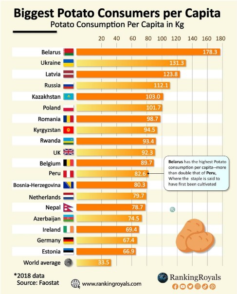Серед десяти країн із найбільшим споживанням картоплі у світі Україна поступилася першістю лише Білорусі — там на середньостатистичного білоруса припадає 178,3 кг картоплі на рік.