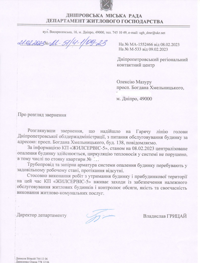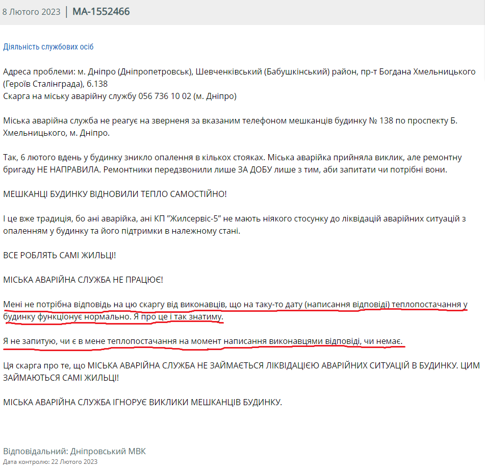 Департамент написав, що, «за інформацією КП «Жилсервіс-5» станом на 08.02.2023 централізоване опалення будинку здійснюється, циркуляцію теплоносія у системі не порушено, а трубопровід та запірна арматура системи опалення в будинку перебувають у задовільному стані, протікання відсутні». А де тут про аварійну службу?